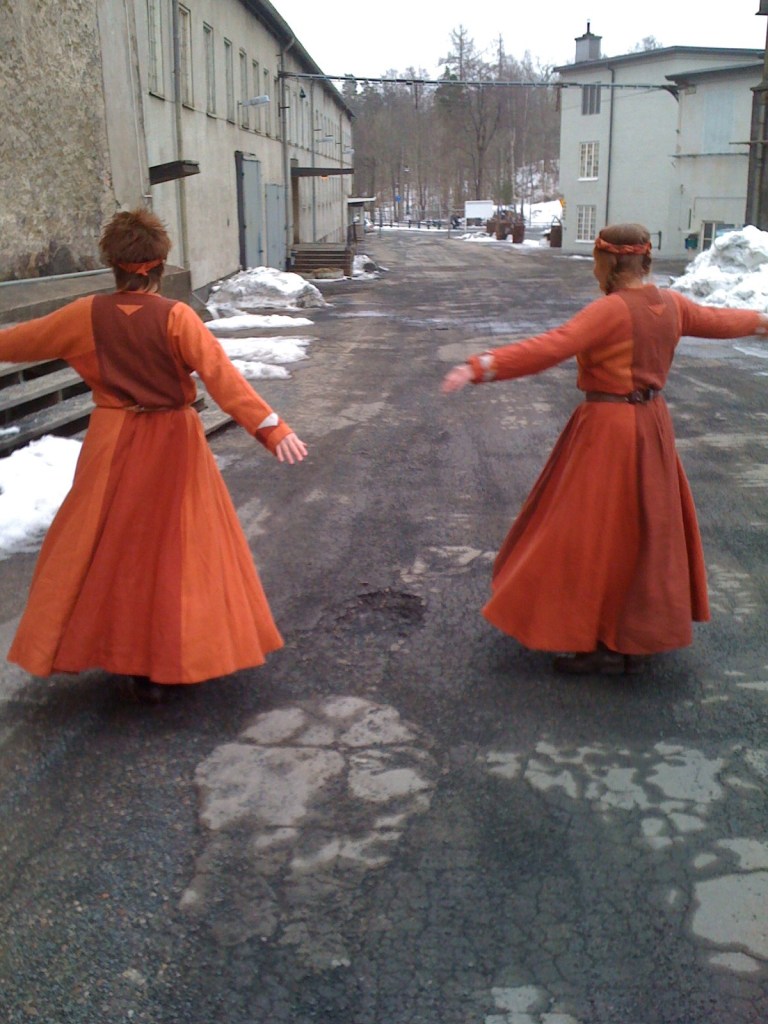 Klänningar till eldskulptur i linnetyg.