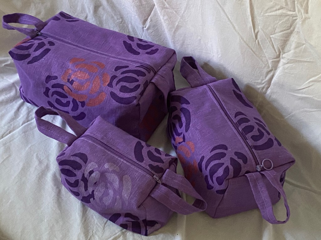 Necessärer med textiltryck. Linne och fodrade med vävd vaxduk.